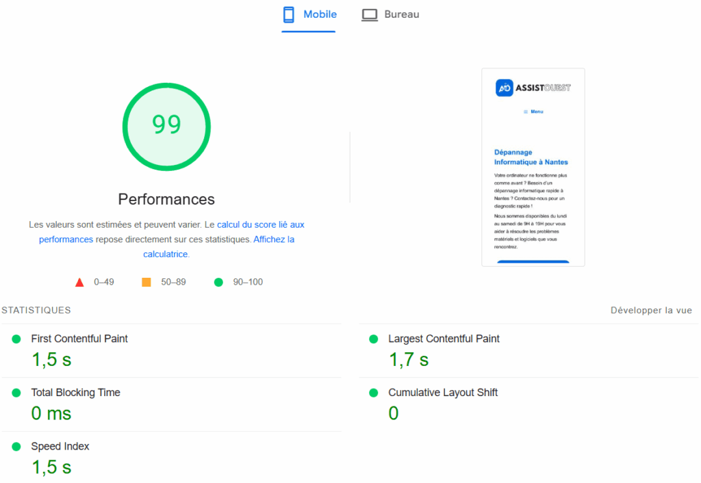 Score PageSpeed de 99/100 sur Mobile avec un chargement en 1,7 seconde