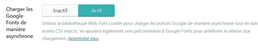 L’option Charger les Google Fonts de manière asynchrone permet de différer le téléchargement des polices Google pour éviter qu’elles ne bloquent le rendu initial de la page.
